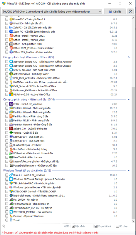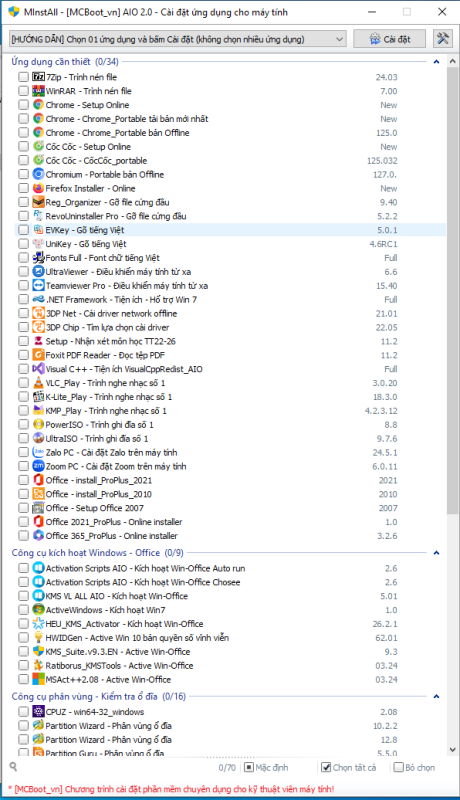 – Chạy AIO-Software chọn 1 công cụ bấm Cài đặt (Không chọn nhiều công cụ một lúc)